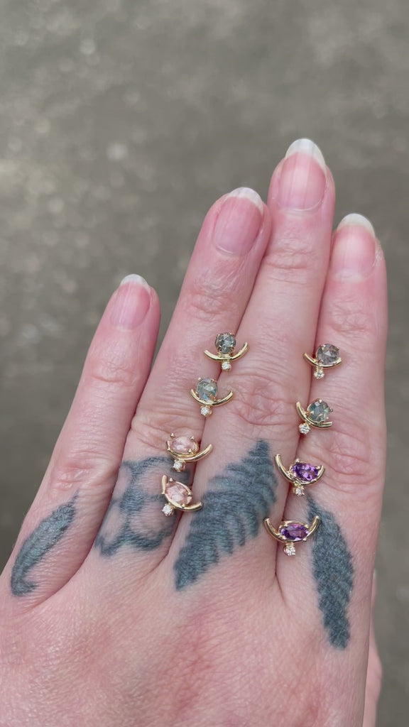 These .60cts ethically sourced Montana amethyst oval earrings are set with .04cts lab grown diamonds in 14kt recycled yellow gold. Measures 10.5mm wide, 6.3mm tall and 3.5mm deep.